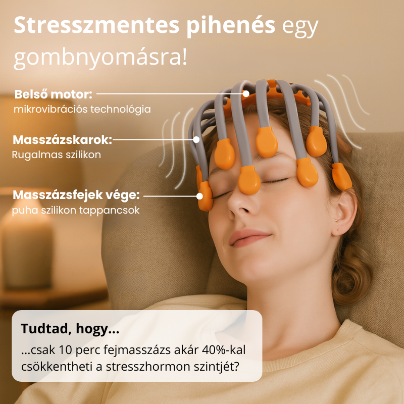 A csápos fejmasszírozó egy könnyen használható, otthoni eszköz, amely finom nyomással oldja a nyak és fej környéki feszültséget. Enyhítheti a stressz és migrén okozta fejfájást, javítja a fejbőr vérkeringését, és hozzájárul a nyugodtabb elalváshoz. Már napi néhány perc használat is érezhetően javíthatja a közérzetedet.